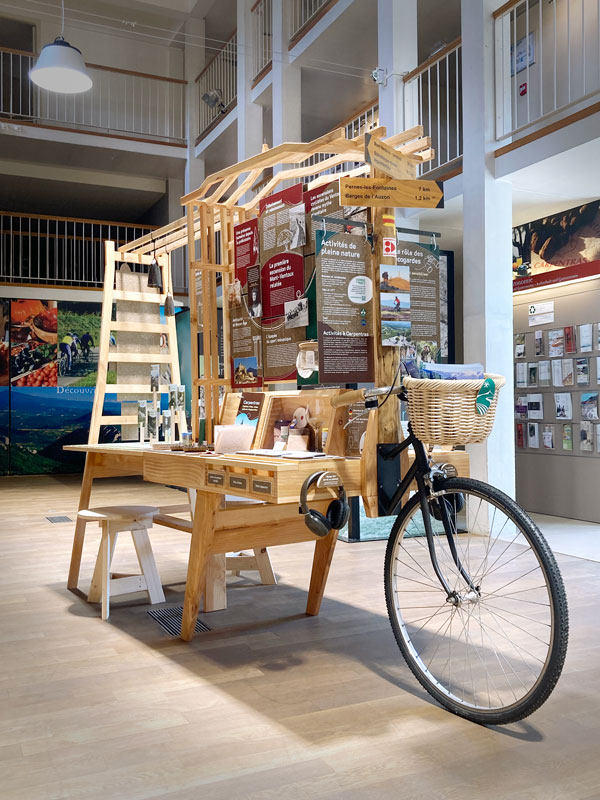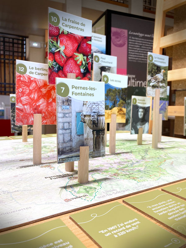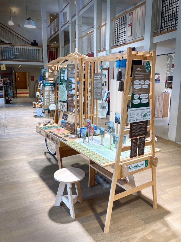 De ces phases de travail sont nées les « Ventilottes », des cabinets de curiosités qui proposent une expérience sensorielle complète. Plus que de simples points d’information, ces relais sont conçus comme des expériences sensorielles et pédagogiques permettant de comprendre le territoire du Mont-Ventoux, ses paysages, son relief et d’être sensible à la richesse de la biodiversité qui le compose.